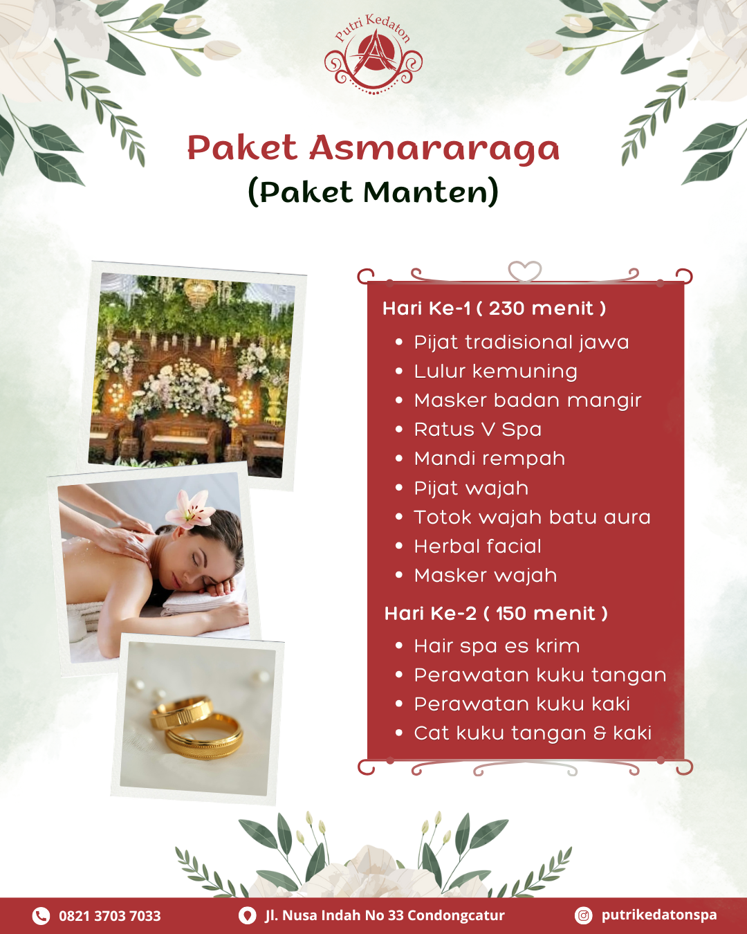 Persiapkan diri menjelang hari pernikahan itu penting untuk dilakukan. Salah satunya dengan perawatan Paket Manten yang bertujuan untuk merawat tubuh dari ujung rambut hingga kaki agar calon pengantin tampil glowing, rileks, dan menambah percaya diri di hari pernikahan. Di Putri Kedaton Spa, menyediakan layanan Paket Asmararaga (Paket Manten). Ada beberapa rangkaian perawatan Paket Asmararaga (Paket… Continue reading Persiapkan Diri Menjelang Hari Pernikahan